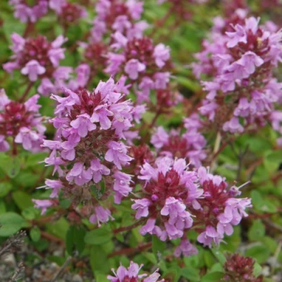 С июня до начала августа Тимьян яйцевидный зацветает — появляются нежные сиренево-розовые цветки, собранные в округлые соцветия на концах побегов. Цветение хоть и не доминирует, но прекрасно подчёркивает структуру растения и добавляет визуального ритма. Аромат — яркий, травянистый, с тонкими камфорными нотами. Он наполняет воздух и делает тимьян не просто растением, а элементом атмосферы.